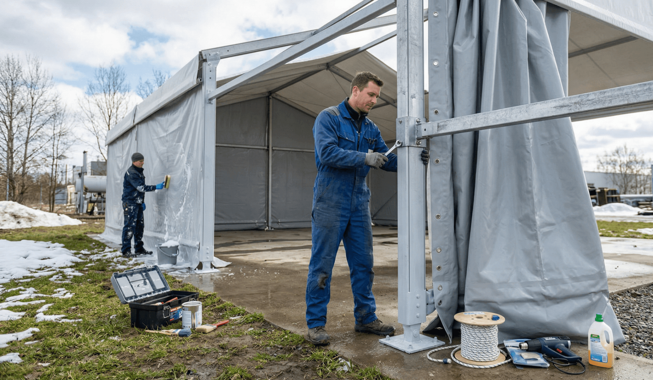 После зимнего хранения или долгого простоя под снегом тентовые конструкции нуждаются в детальном осмотре и техническом обслуживании. Весенняя подготовка включает в себя глубокую очистку полотна ПВХ, проверку целостности сварных швов, удаление коррозии с металлических элементов и обязательную подтяжку всех соединительных узлов. Эти простые действия помогают предотвратить разрыв ткани при резких порывах ветра и значительно продлевают срок службы изделия. Своевременный уход обходится гораздо дешевле, чем полная замена покрытия или выравнивание деформированных стоек каркаса.